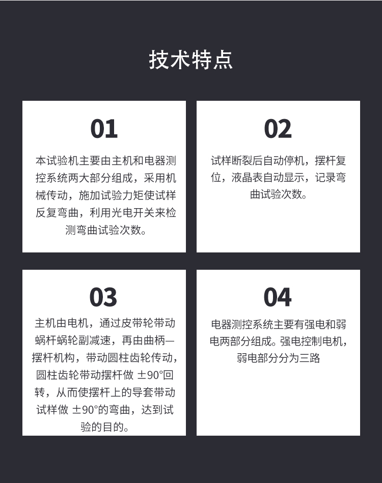 本試驗機主要由主機和電器測控系統兩大部分組成,采用機械傳動,施加試驗力矩使試樣反復彎曲,利用光電開關來檢測彎曲試驗次數。試樣斷裂后自動停機,擺桿復位,液晶表自動顯示,記錄彎曲試驗次數。