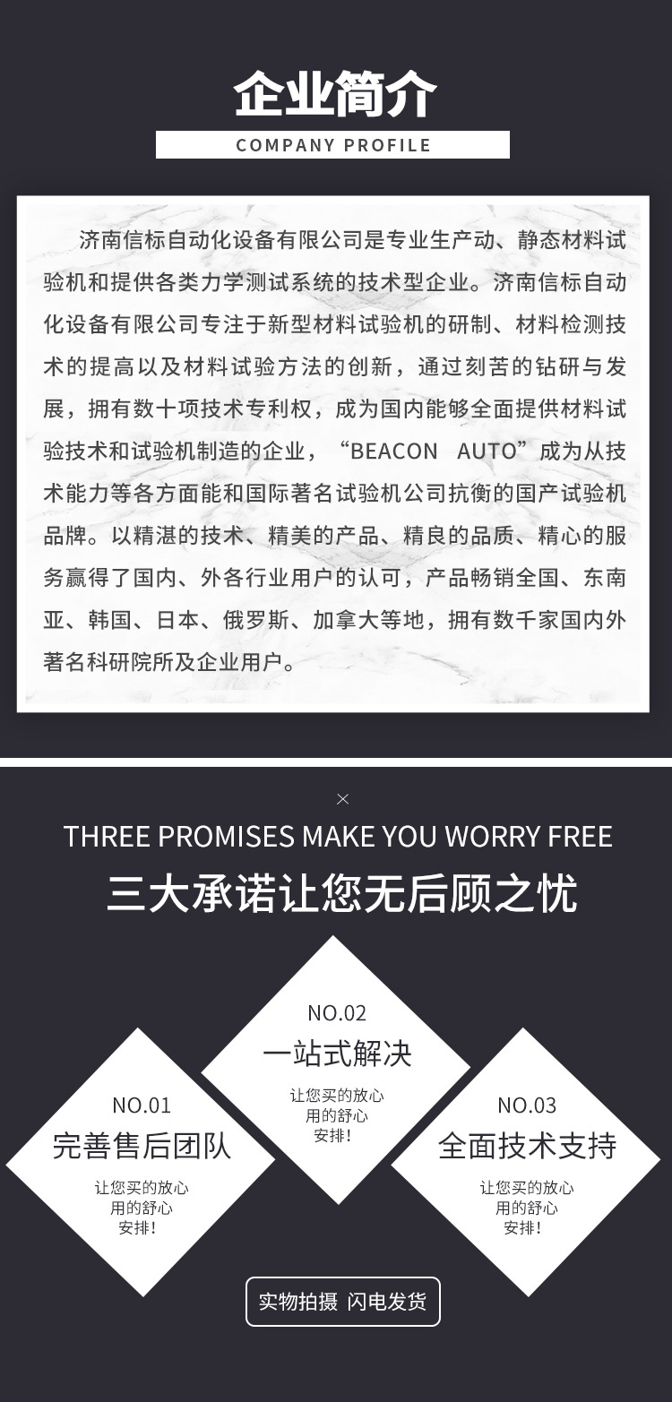 濟南信標自動化設備有限公司主要生產(chǎn):動靜態(tài)萬能疲勞試驗機,接骨板彎曲試驗機,縫合線拉伸疲勞試驗機,髖膝關節(jié)磨損試驗機,電子萬能試驗機、液壓萬能試驗機、巖石三軸、四軸,電液拉力試驗機,材料試驗機,高低溫蠕變,高低頻疲勞,拉伸、扭轉(zhuǎn)、杯突等二十多個系列兩千多個的品種。