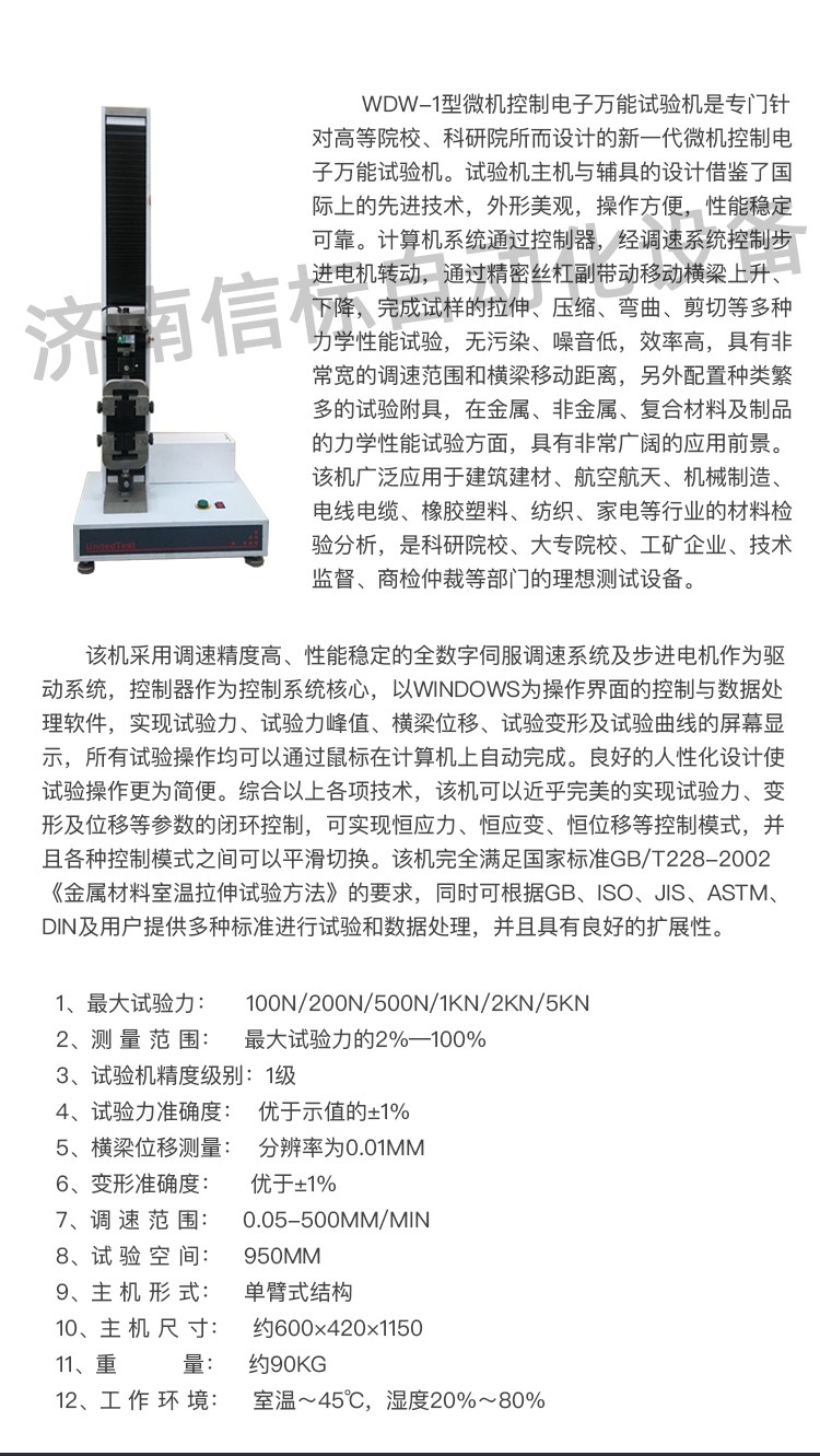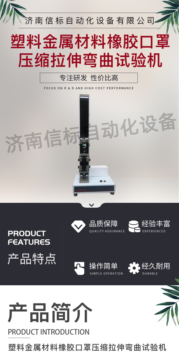 金屬材料壓縮彎曲實驗口罩塑料拉伸強度試驗機主要功能及特點: 1、主機: 1.1調速系統采用伺服電機和自主研發減速系統,性能穩定可靠,具有過流、過壓、過載等保護裝置。調速范圍可達0.05~500mm/min。 1.2傳動部分采用圓弧同步齒形帶,精密絲杠副傳動,傳動平穩,噪音低,傳動效率高。 1.3萬向節采用十字插銷結構,而且具有擺角限制功能,一方面便于試樣夾持,保證試驗同心度,另一方面很好的消除了不規則試樣對傳感器的影響。 2、控制系統、操作軟件及數據處理系統 2.1計算機控制系統,具有集成度高、性能穩定、調整方便等優點。可以對實驗數據進行實時采集,對實驗特性曲線實現實時動態顯示,試驗數據文件能以Access常用數據庫或SQLserve大型數據庫的方式保存,方便實現客戶的資源共享及網絡管理,以及用戶的再分析。對于用戶自定義的各種word2000報表,該軟件可輕松實現訪問,解決了不同用戶或同一用戶在不同時期對試驗報表有不同需要的難題。該軟件可處理試驗力、位移、時間、變形的原始數據及由此派生的曲線。