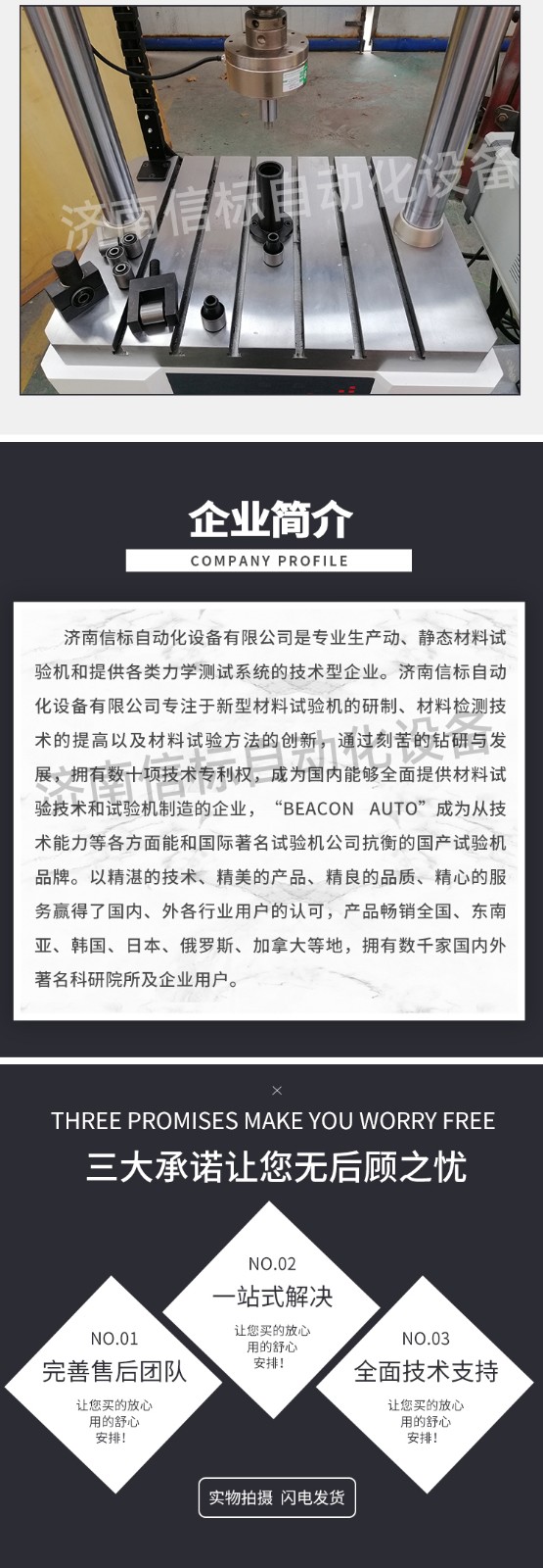 濟南信標自動化設(shè)備有限公司主要生產(chǎn):動靜態(tài)萬能疲勞試驗機,接骨板彎曲試驗機,縫合線拉伸疲勞試驗機,髖膝關(guān)節(jié)磨損試驗機,電子萬能試驗機、液壓萬能試驗機、巖石三軸、四軸,電液拉力試驗機,材料試驗機,高低溫蠕變,高低頻疲勞,拉伸、扭轉(zhuǎn)、杯突等二十多個系列兩千多個的品種。
