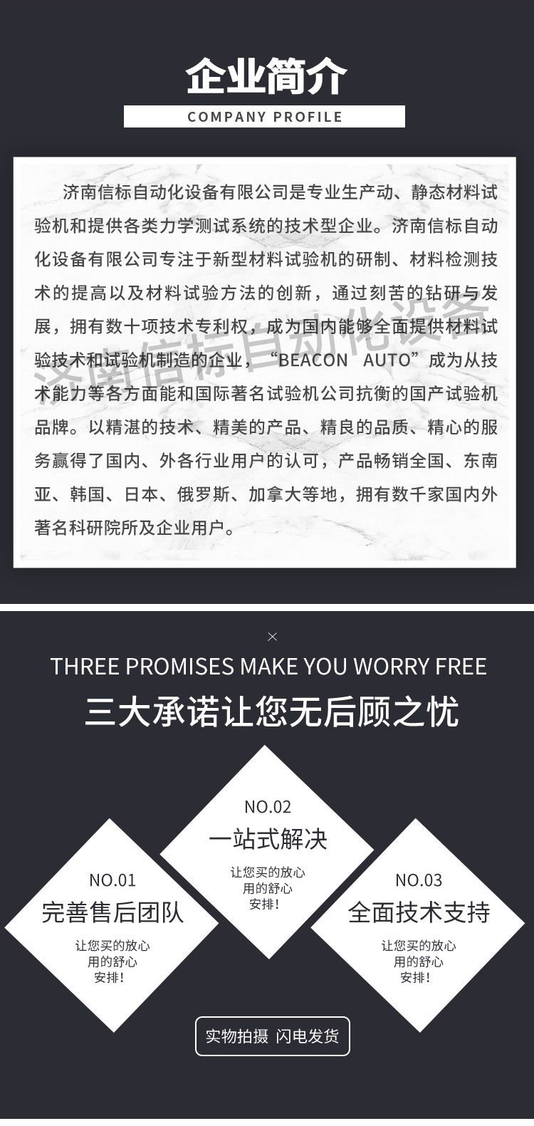 濟南信標(biāo)自動化設(shè)備有限公司主要生產(chǎn):動靜態(tài)萬能疲勞試驗機,接骨板彎曲試驗機,縫合線拉伸疲勞試驗機,髖膝關(guān)節(jié)磨損試驗機,電子萬能試驗機、液壓萬能試驗機、巖石三軸、四軸,電液拉力試驗機,材料試驗機,高低溫蠕變,高低頻疲勞,拉伸、扭轉(zhuǎn)、杯突等二十多個系列兩千多個的品種。